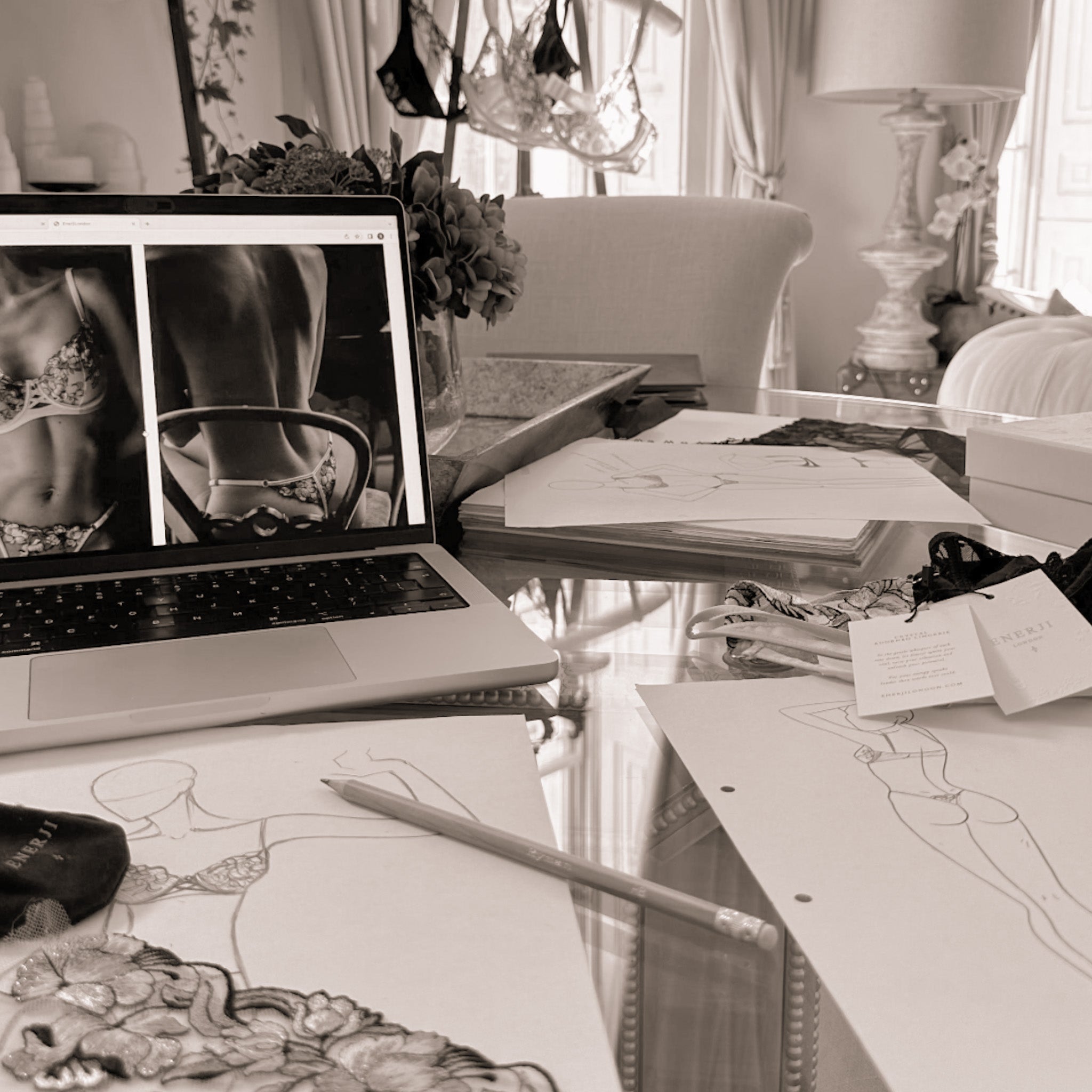 Our journey begins at the heart of our creations with our bespoke Swiss embroidery; where enchanting florals breathe life into all our creations. An initial sketch of imagination unfolds onto a digital canvas where the vision is brought together through the precision of colour and intricate detailing. Together with Enerji's seasoned design team, we embark on a global quest to source the finest materials from around the world to craft our first sample, hand-stitched by our skilled UK atelier. Months of meticulous work follow, perfecting every aspect of the garment through rigorous trials, tests, and adjustments to ensure the final fit, feel, and aesthetic are nothing short of perfection.